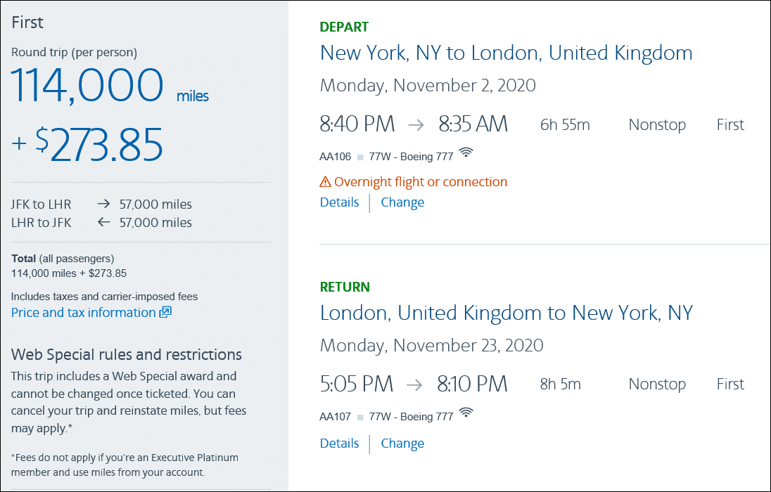 We found a cheap flash-mileage deal on American Airlines from New York to London for 114,000 miles round-trip in First Class (to quote our analyst: “I’ve never seen this. Period.”) To give you an idea of the value, just last year it cost 115,000 miles round-trip (if you could ever actually find it) on this same route in Business Class. So you’re able to get First Class tickets for Business Class prices by booking now.