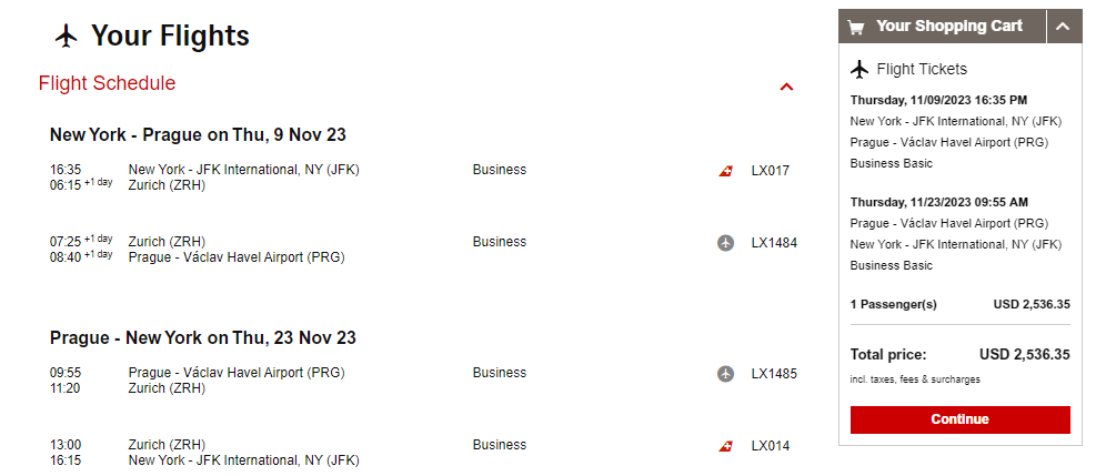 Screenshot of sample fare on swiss.com:
