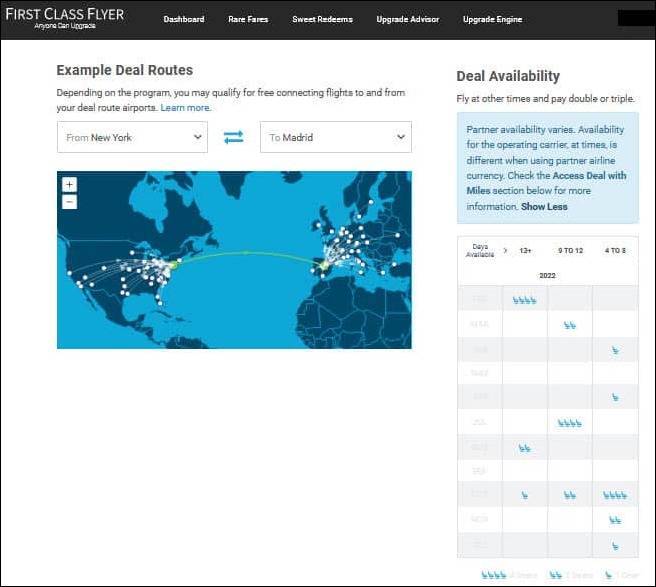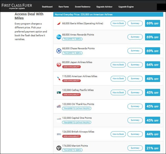 Otherwise hard-to-find and often on a flash basis, mileage deals are visible at a glance with FCF’s Sweet Redeems. You’ll get a good sense of availability by month — for one, two, and four seats — so you can immediately see if it lines up with your plans and the number of your travel companions.