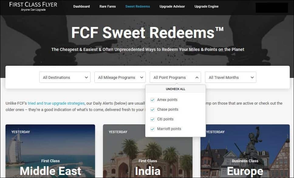 Researching (on your own) which mileage currency to use is a pain in the patootie, so we injected all that into FCF’s Sweet Redeems, making it ridiculously easy. In the twitch of a squirrel’s nose, you’ll see which of your miles or credit card transferable points, and/or which partners work best for your particular situation.